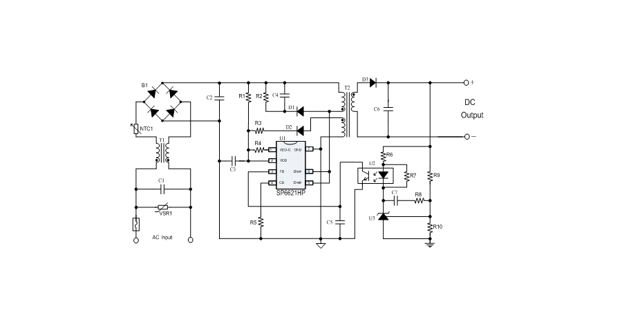 SP6621HP在PWM模式下工作于固定頻率,這個頻率是由內部精確設定的。在空載或者輕載時,工作頻率由IC內部調整。芯片可以工作在綠色模式,以此來減小輕載時的損耗,提高整機的工作效率,SP6621HP在啟動和工作時只需要很小的電流,可以在啟動電路中使用一個很大的電阻,以此來進一步減小待機時的功耗。芯片內置有斜坡補償電路,當電路工作于大占空比時,避免次諧波振蕩的發生,改善系統的穩定性。內置有前沿消隱時(Leading-edge blanking time),消除緩沖網絡中的二極管反向恢復電流對電路的影響。SP6621HP采用了抖頻技術,能夠有效改善系統的EMI性能。系統的跳頻頻率設置在音頻(20KHz)以上,在工作時可以避免系統產生噪音。SP6621HP內置多種保護,包括逐周期限流保護(OCP),過載保護(OLP),過壓保護(OVP),VDD過壓箝位,欠壓保護(UVLO),過溫保護(OTP)等,通過內部的圖騰柱驅動結構可以更好的改善系統的EMI特性和開關的軟啟動控制。SP6621HP使用DIP7無鉛封裝。