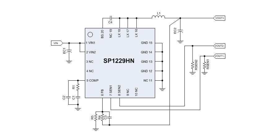 SP1229HN適用于有限流要求的DC/DC開關電源,芯片采用QFN20L-5×5封裝,僅需較少的外部器件。