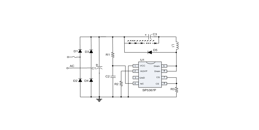 SP5367P是一款高精度非隔離降壓型LED照明轉換芯片。此款芯片工作在電感電流臨界連續模式,適用于85Vac~265Vac全電壓范圍下的非隔離降壓型恒流LED驅動電源。