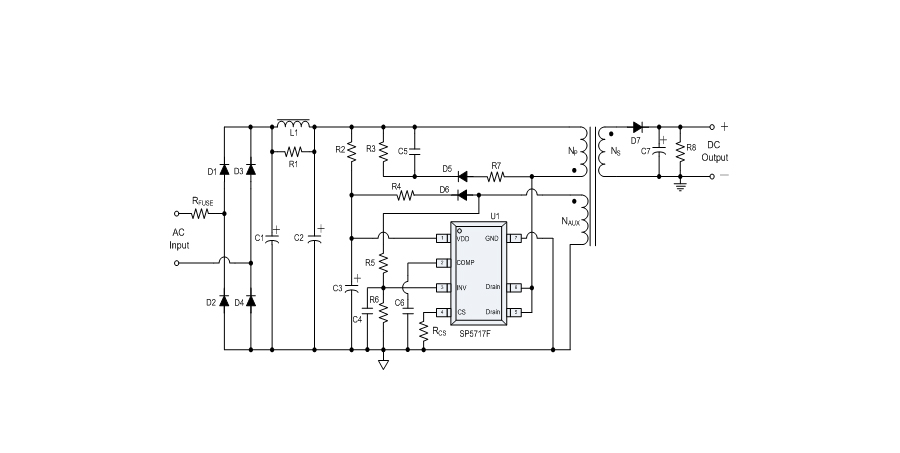 SP5717F提供上電軟啟動功能與各種可自恢復的保護功能,包括逐周期限流保護(OCP),VDD過壓保護(OVP),VDD過壓箝位,欠壓保護(UVLO),過溫保護等。SP5717F具有的抖頻功能,可以提供更好的EMI性能。
