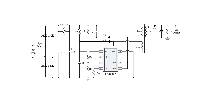 SP2638F 是一款性能優異的原邊反饋控制電路,應用于小功率 AC/DC 充電器與適配器。控制電路使用原邊采樣技術進行精確的恒流、恒壓控制,可以省去一般應用中的光耦與 TL431。