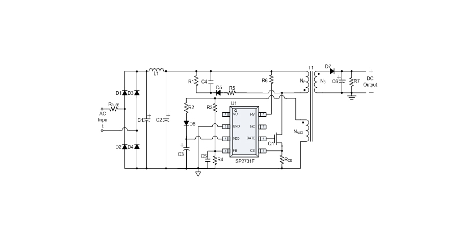 SP2731F提供全面的保護功能,包括逐周期限流保護(OCP)、VDD過壓保護(OVP)、VDD欠壓保護(UVLO)、VDD鉗位、FB開/短路保護、輸出短路保護、輸出過壓保護、過溫保護等。